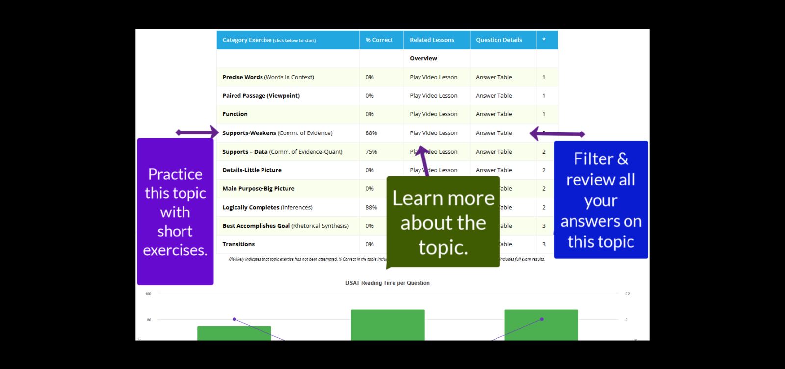 Below this chart, the exam section(s) is divided into question topics. There are three basic activities to perform on each topic: review all the questions you took for that topic, access lessons on that topic, and practice SAT problems for that topic. All the while, your goal is to drive the low bars higher. Simple enough?