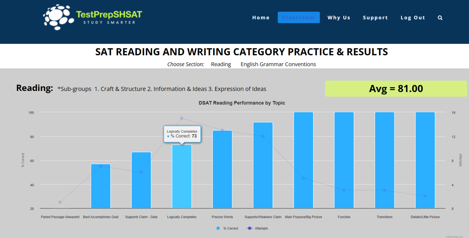 Some students like to begin on the category page because this is where your improvement happens. Others use it as a supplement to periodic exams. It’s your car. You drive. Your windshield is in front of you at the top. You will see your scores for each question topic sorted worst to best. Use it to focus your effort and drive your weak scores higher.