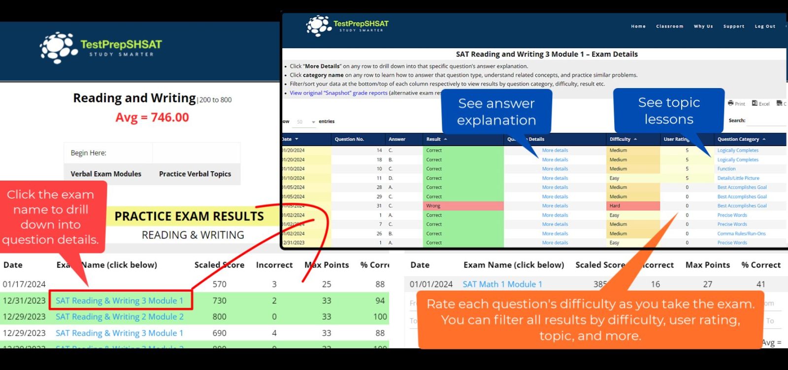 During the exam, you can flag questions for review and even rate the problems you find difficult as you go—extremely useful for post-exam review. Once you submit your exam, it is automatically graded, you receive a score report onscreen, a score report by email, and your result is recorded on the dashboard to compare to recent exams and drill down into the details at any future time. On the dashboard, simply click the exam name to see your detailed results color coded for ease of use along with additional critical details for each question. Drill down further into any answer explanation or link directly from a given question to related lessons (or use your instructor to help).