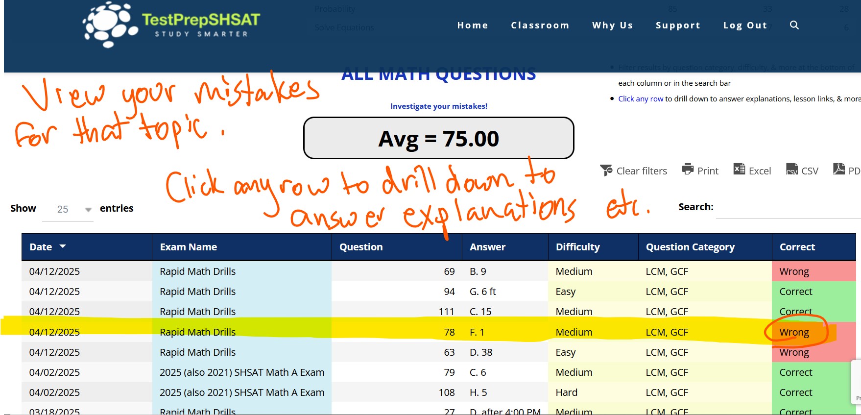 Click “Math Drill Down” from the dashboard to see all the questions from all the exams and exercises you have taken and a table listing your 10 weakest math topics.